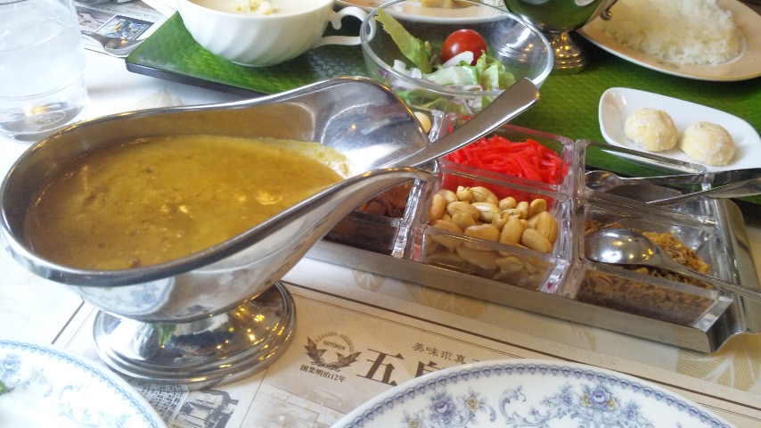 なんともノスタルジックでオシャレなお皿。そしてソースボートに入ったルーは黄色い。