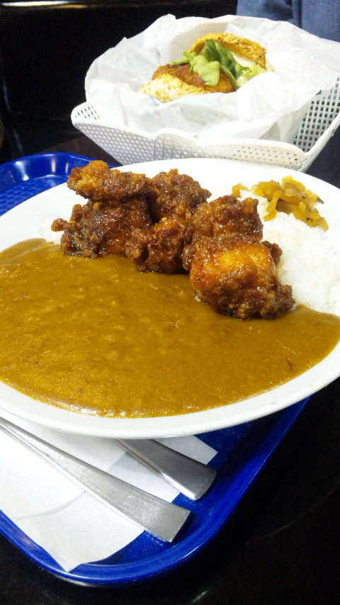 私はチャイチキカレー。助手Mはチャイチキバーガーとオリジナルラキポテ300円。ホットコーヒー200円は店内なら100円だ。