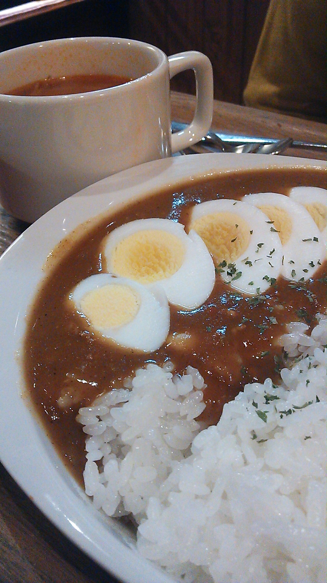 ⑥あっさりサラサラスープ。カレーラーメンとして食べるってよりスープ感覚で。