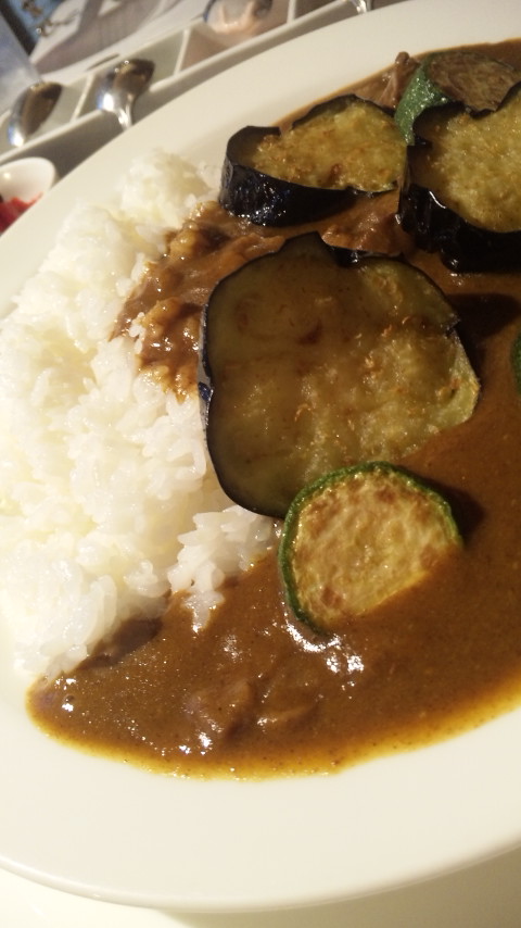 期待値を高めカレー。大きなナスとズッキーニが目立つ。